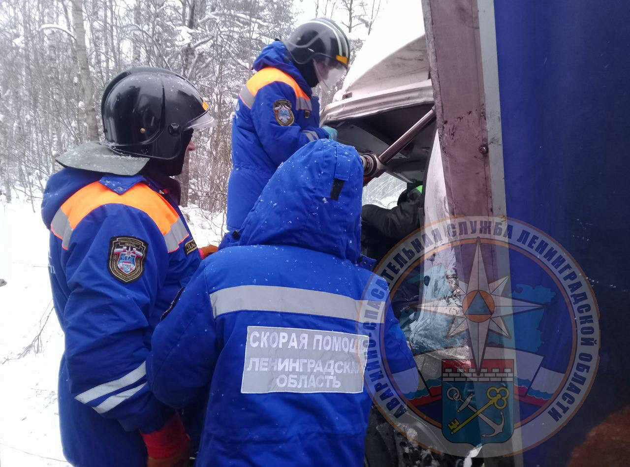 На место аварии выезжала дежурная смена поисково-спасательного отряда города Шлиссельбург. В ходе аварийно-спасательных работ специалисты с применением гидравлического инструмента деблокировали водителя грузового автомобиля КамАЗ и передали его сотрудникам скорой медицинской помощи.