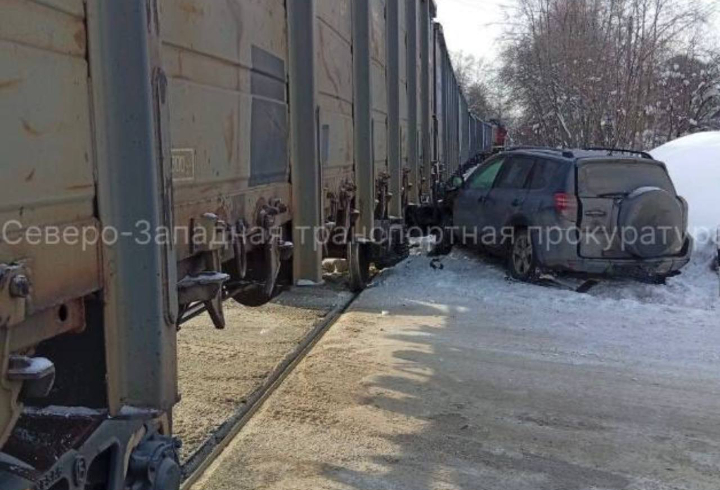 В Ленинградской области легковой автомобиль выехал на железнодорожный переезд перед приближающимся поездом. Столкновения избежать не удалось.