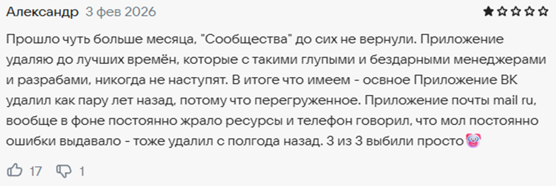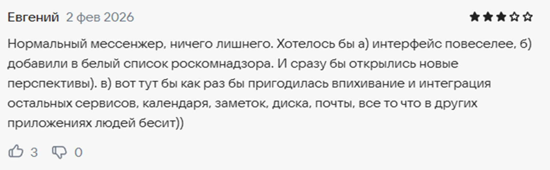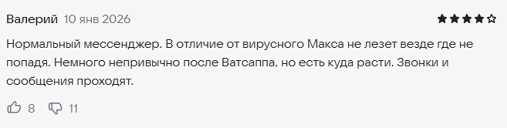 Но и проблема та же — он не создан для личного общения. Более того, в отличие от сервисов VK, пользователи жалуются на нехватку функций и сервисов. При этом люди из числа противников MAX убеждены, что это приложение, если его улучшат, стало бы гораздо более притягательным вариантом. Тем более, учитывая, что у компании есть ряд сервисов, которым многие граждане пользуются чуть ли не регулярно.