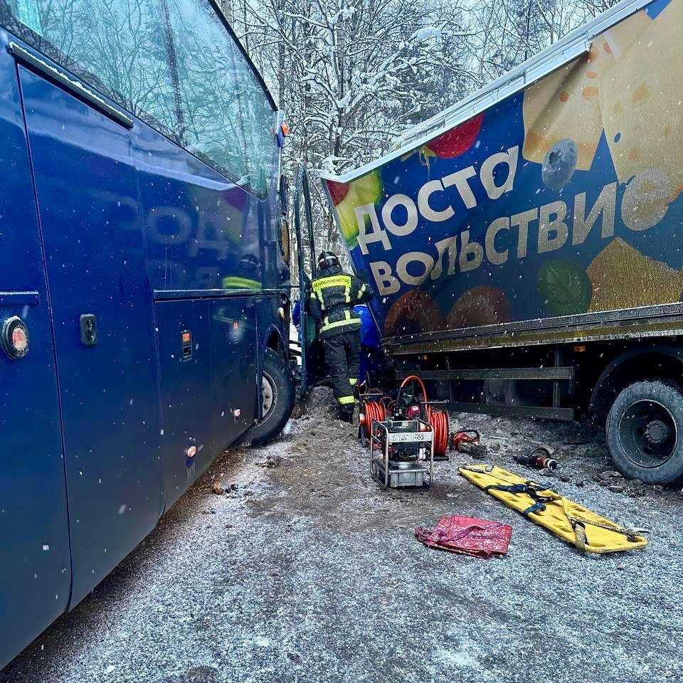 В Кировском районе Ленинградской области после столкновения грузового автомобиля КАМАЗ со служебным автобусом потребовалась помощь спасателей и медиков.