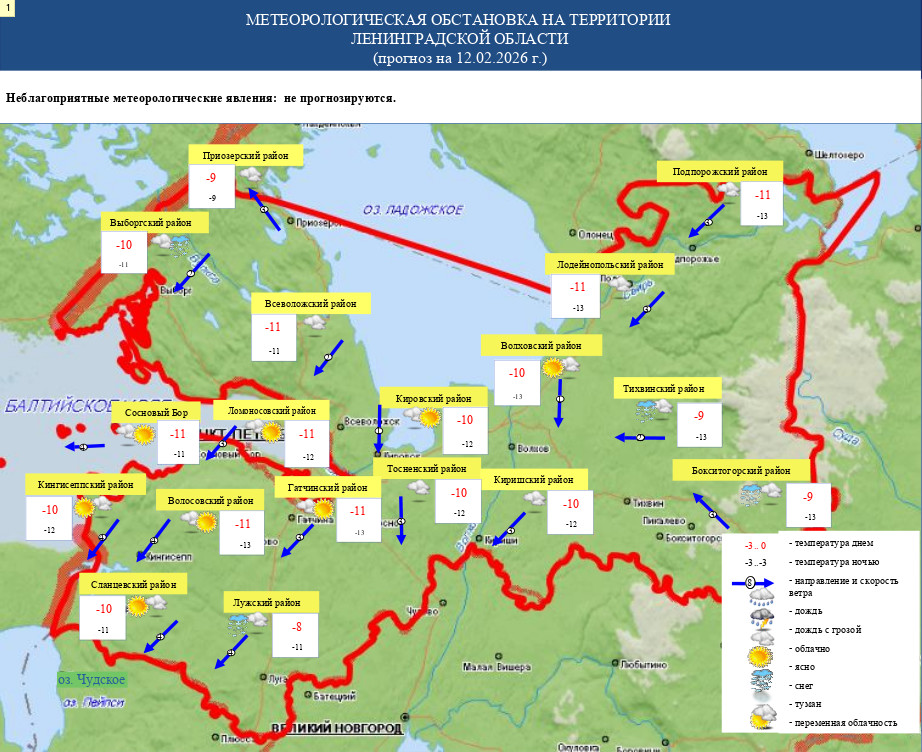 По данным ежедневного прогноза ФГБУ «Северо-Западное УГМС», 12 февраля на территории Ленинградской области прогнозируется облачная погода. Ожидается небольшой, местами умеренный снег.