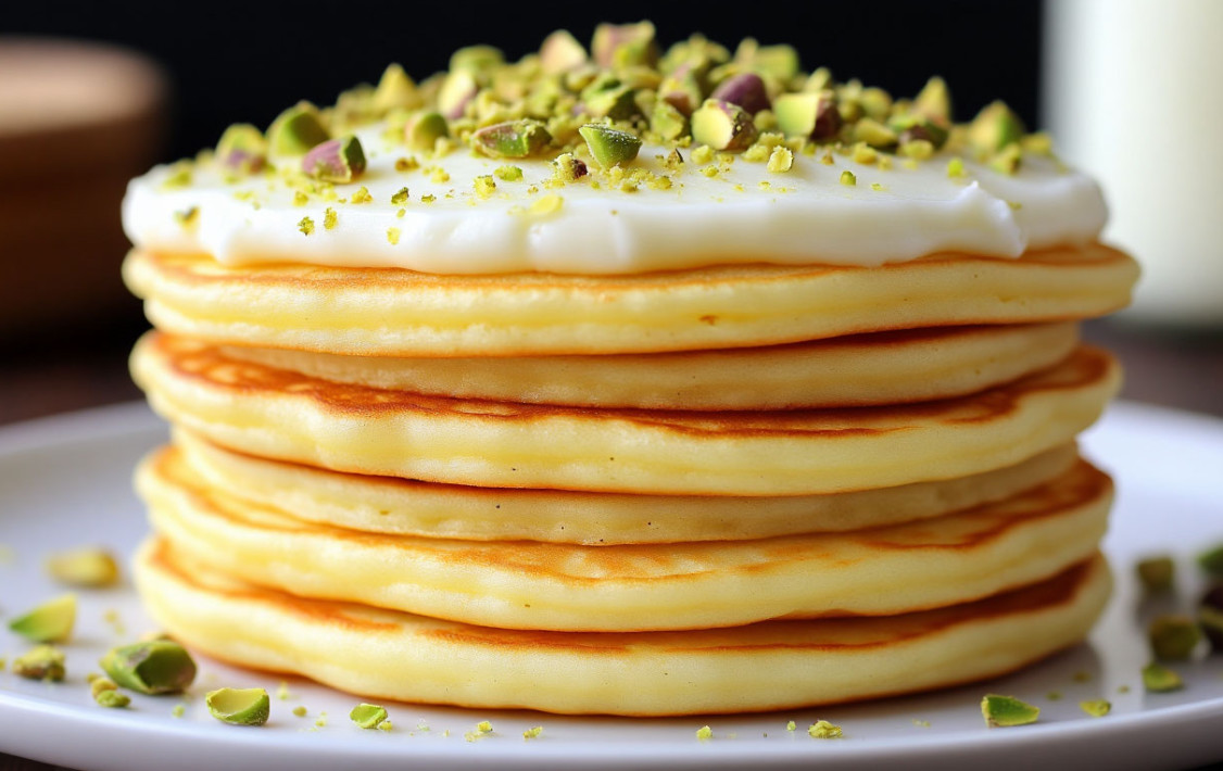 Как готовить: смешайте яйца с сахаром и солью, добавьте молоко и муку. Введите фисташковую пасту и масло. Жарьте тонкие блины на разогретой сковороде. Подавайте с крем-сыром или сливками.