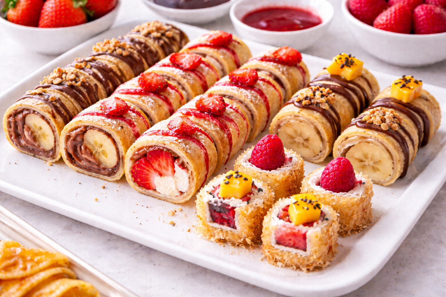 Как готовить: намажьте блин крем-сыром, добавьте ягоды или банан, сверните плотный рулет, охладите 10-15 минут, нарежьте «роллами». Отличный десерт для подачи на праздничном столе.