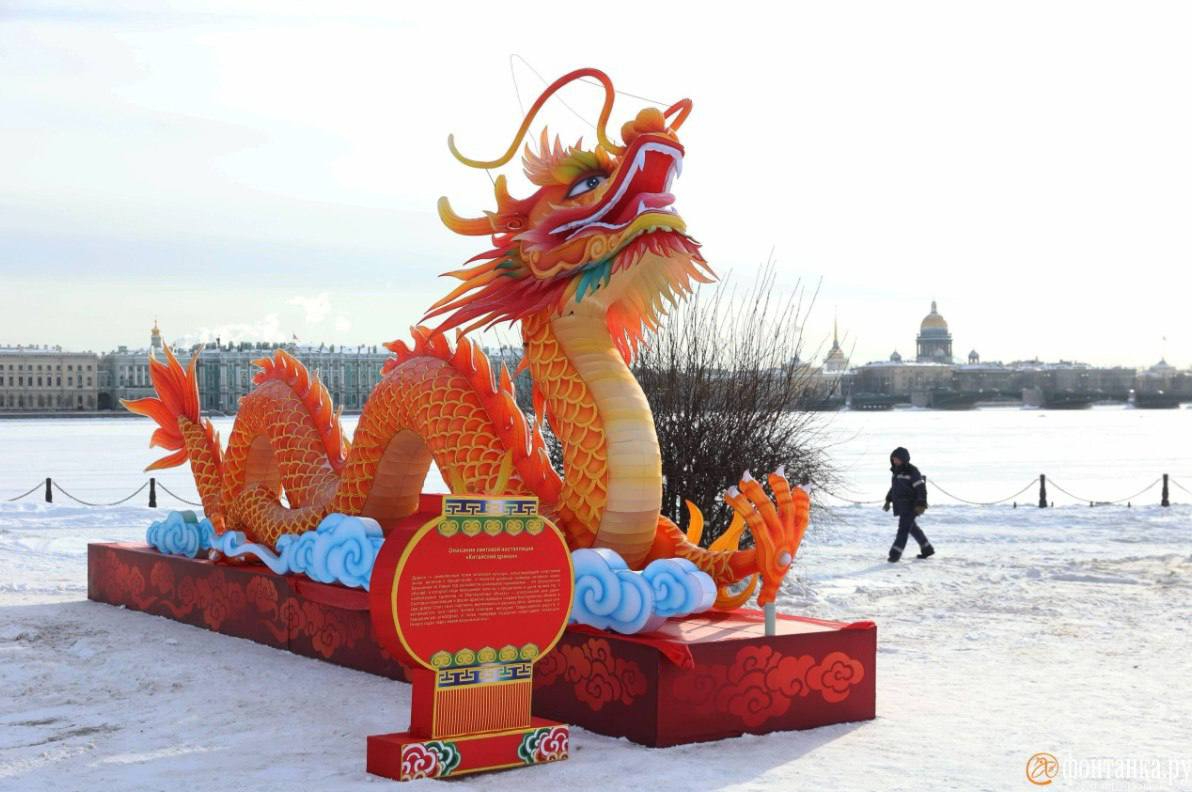 На стрелке Заячьего острова - десять уникальных инсталляций высотой до четырех метров и длиной до десяти метров. Уже появились дракон, феникс и символ года по восточному календарю - Огненная Лошадь.