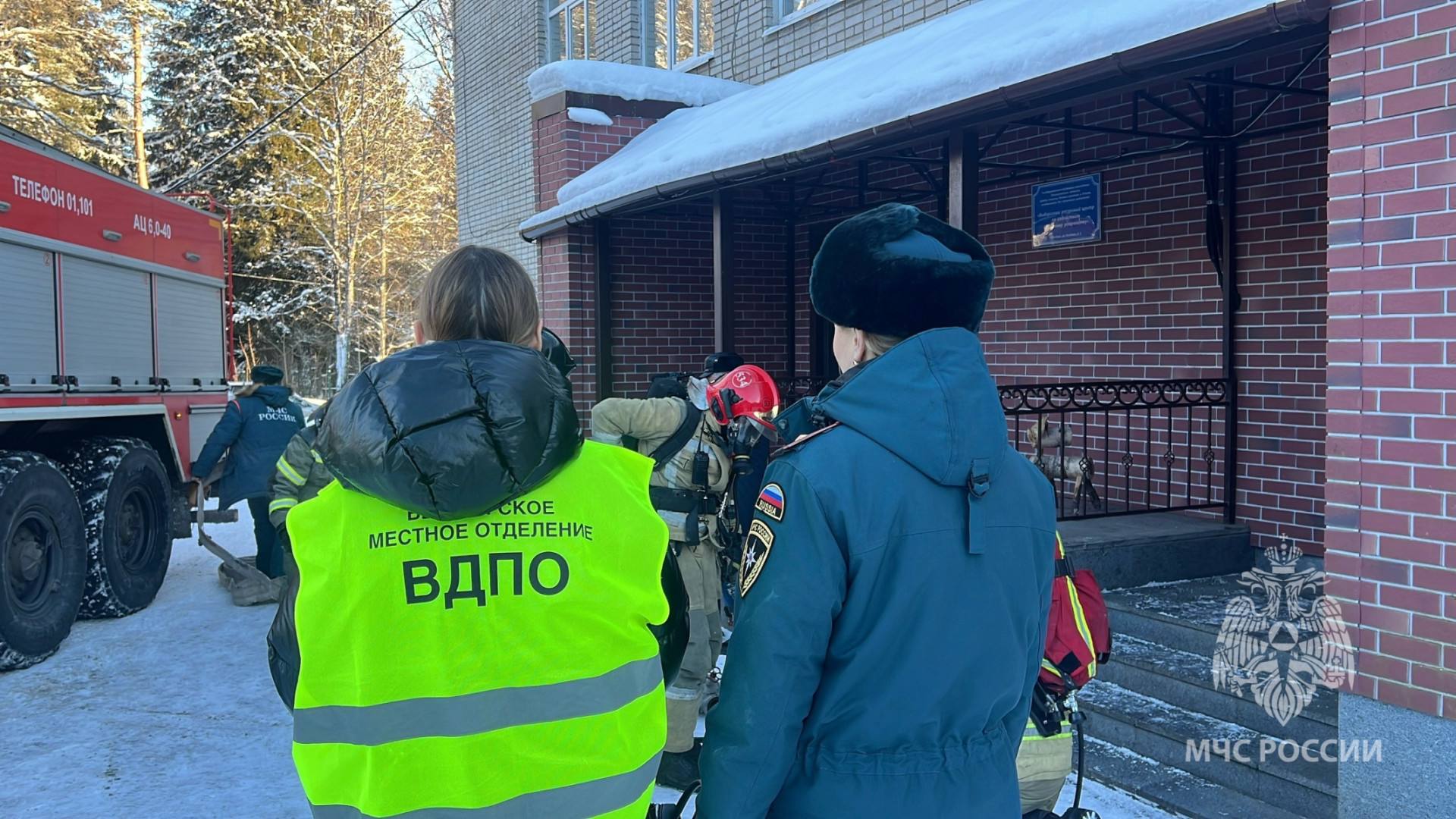 Легенда учений: пожар поизошел в музыкальном зале. Персонал и дети оперативно покинули здание, но один ребенок остался. Пожарные провели разведку, потушили «огонь» и спасли пострадавшего.