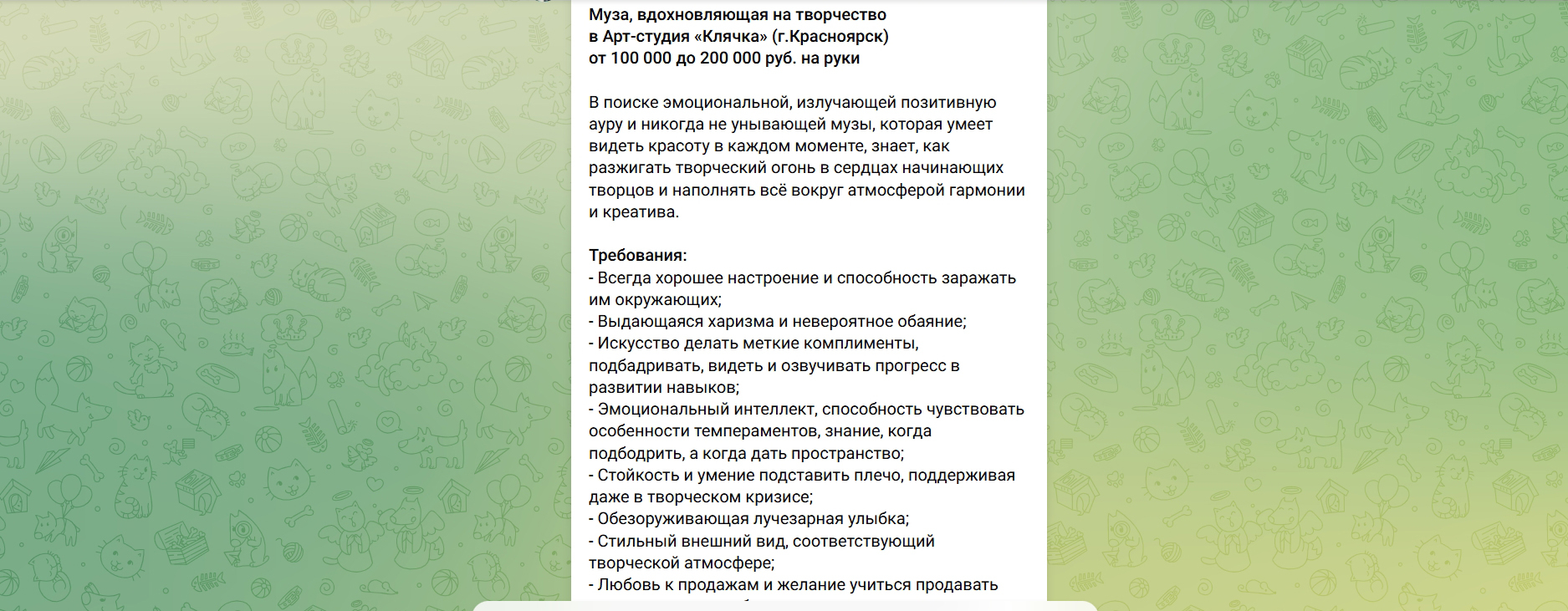 Тем не менее, если вчитываться подробнее, то на деле вакансия оказывается самой простой работой администратора, где нужно общаться с гостями и продавать им сопутствующие товары для творчества.