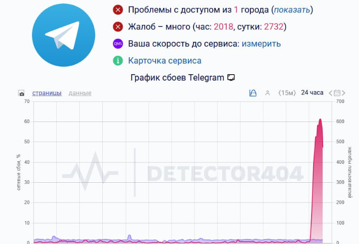 Россияне массово жалуются на перебои в работе Telegram. По данным профильного портала мониторинга, за последний час зарегистрировано более двух тысяч обращений пользователей.
