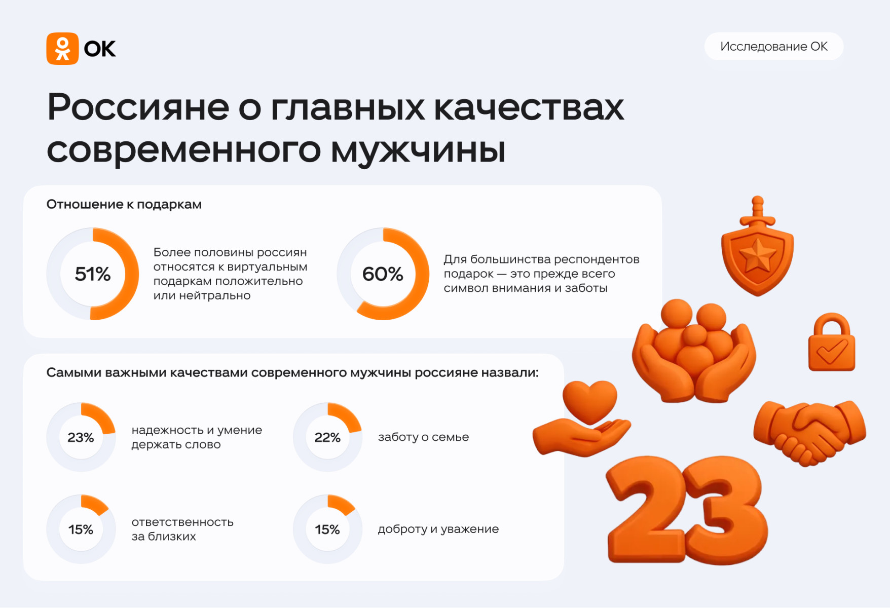 Социальная сеть «Одноклассники» провела исследование среди пользователей и выяснила, какие качества россияне считают ключевыми для современного мужчины, какие ценности ставят на первое место и как относятся к подаркам на 23 февраля.