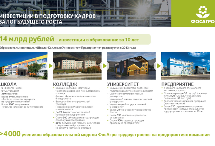 «Вот уже 25 лет – с момента создания ФосАгро в 2001 году – забота о трудовом коллективе и всех жителях регионов присутствия – наш безусловный приоритет. Именно на этом фундаменте мы каждый год ставим производственные рекорды, создаём новые мощности, развиваем инновации, увеличиваем налоговые отчисления. Два года подряд на реализацию социальных и благотворительных проектов мы выделяем рекордные 14 млрд рублей. Мы помогаем масштабной работе государства по воспитанию здоровой физически и духовно молодёжи в рамках проекта «Детям России – образование, здоровье и духовность» (ДРОЗД), подготовке профессиональных кадров начиная со школьной скамьи, созданию комфортной городской среды и развитию местных систем здравоохранения», - подчеркнул Александр Гильгенберг.
