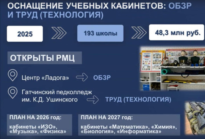 Кроме того, по федеральной программе 193 школы получили современное оборудование для кабинетов ОБЖ и «Труд (Технология)» на сумму 48,3 млн рублей. Созданы региональные ресурсно-методические центры по этим предметам.