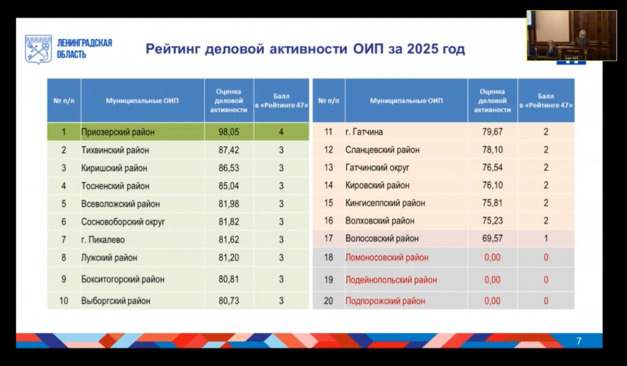 «По итогам 2025 года выстроился следующий рейтинг: в тройку лидеров пошли Приозерский район, Тихвинский район и Киришский район. Внимания заслуживают также Всеволожск, Луга, Бокситогорск, Выборг, Сосновый Бор и Пикалево, которые получили 3 из 4 возможных баллов, которые опять же вошли в «рейтинг 47», — отметила Светлана Нерушай. — Мы также проанализировали количество баллов по рейтингу деловой активности за последние три года. Если в 2022 году из десяти примеров, которые мы привели на слайде, только у двух районов были баллы, которые вошли в «Рейтинг 47», то в 2025 году уже совсем другая картина».