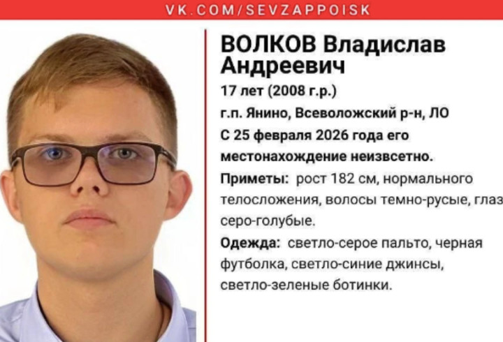 С 25 февраля во Всеволожском районе Ленинградской области разыскивается 17-летний Владислав Волков. Он ушел из дома в Янино-1 и до сих пор не вернулся.