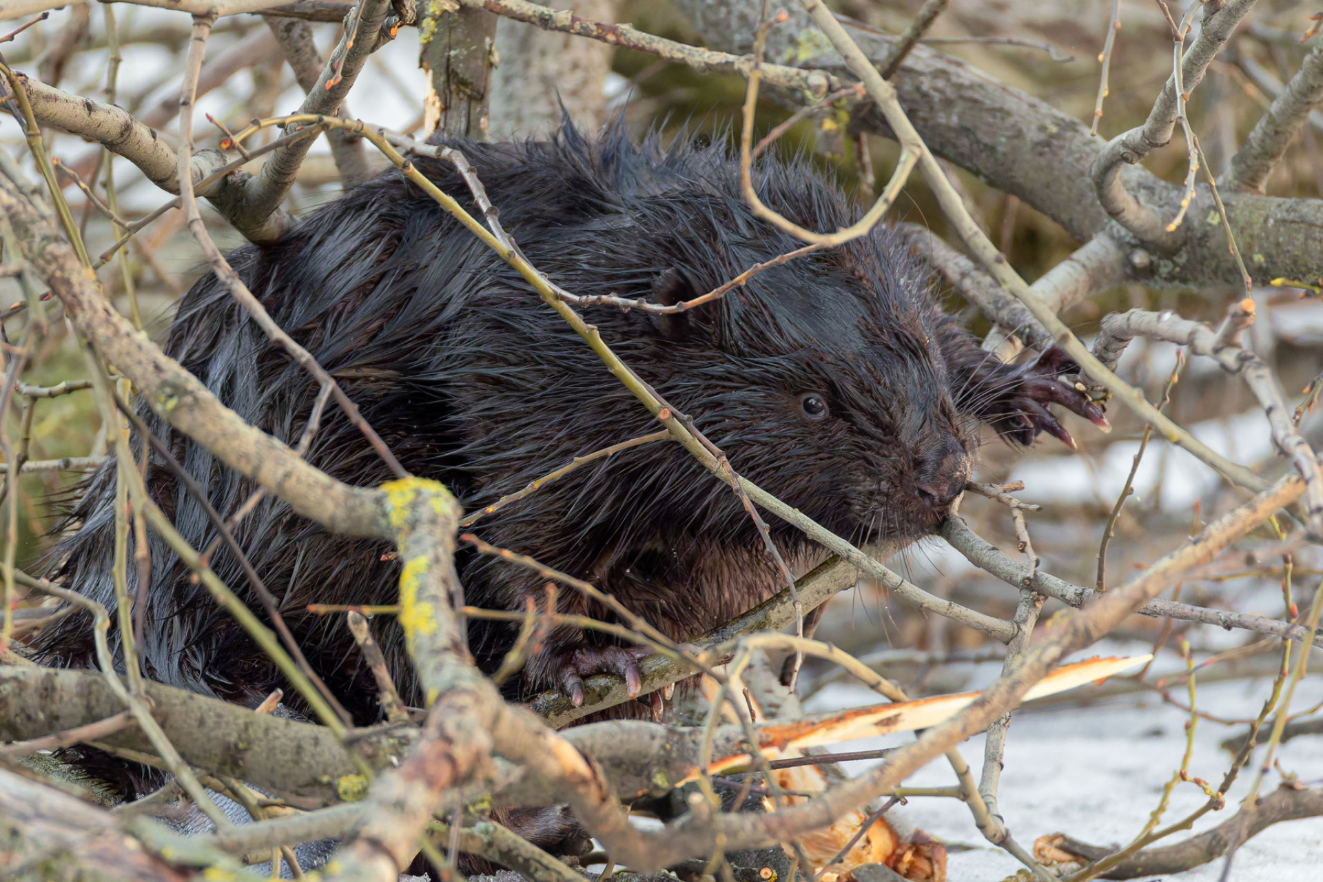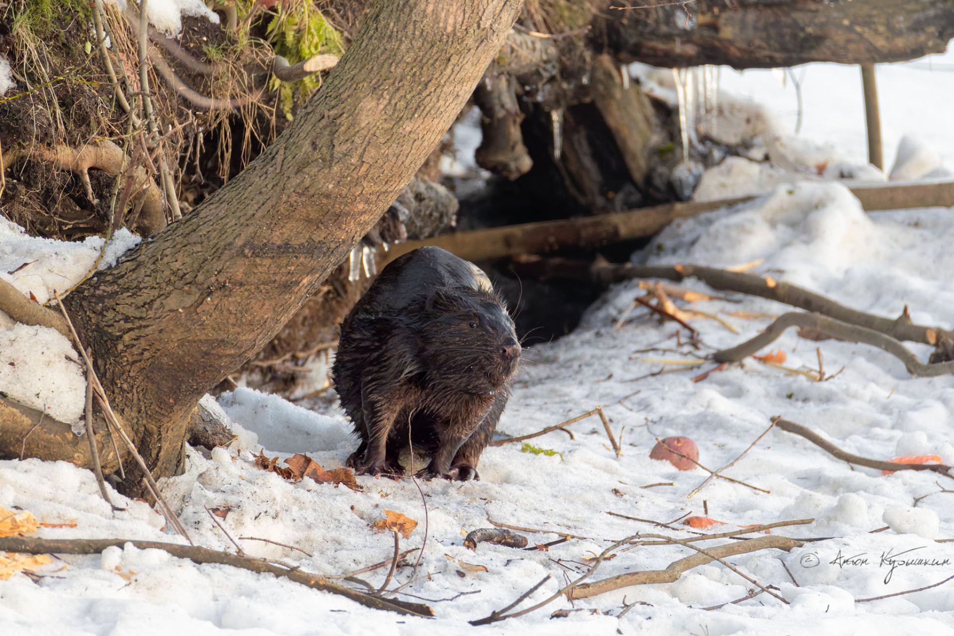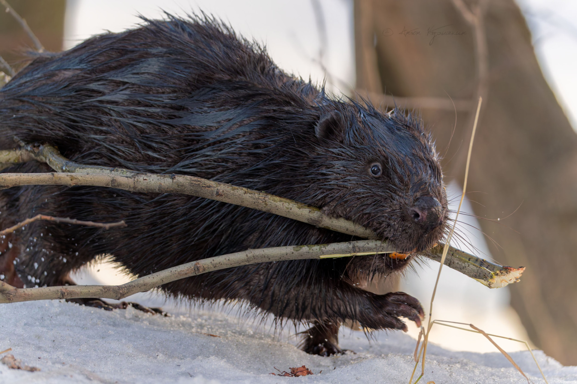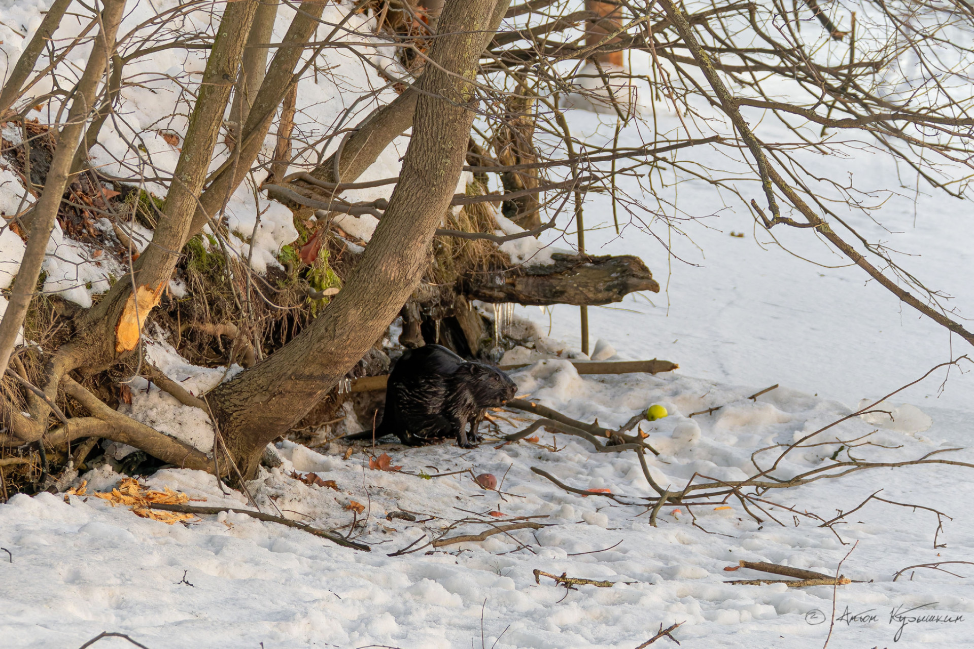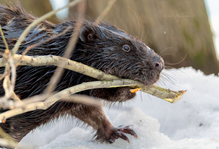 Необычного городского жителя фотограф запечатлел накануне, 6 марта. По словам автора снимков, бобр устроил настоящее «представление» - занимался заготовкой еды и обустройством своего жилища неподалеку от воды.