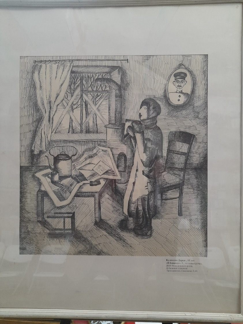 Среди представленных работ - рисунок Дарьи Кудиновой «В блокаду», где изображен момент получения долгожданного письма с фронта. Работа девятилетнего Даниила Мелихова «За водой. Блокада» рассказывает о тяжелых буднях ленинградцев, когда жители брали воду из Невы.