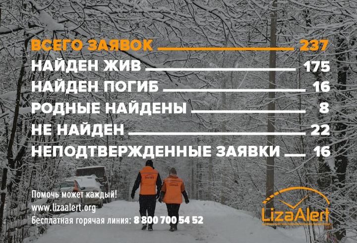 По данным отряда, поиски 175 человек завершились благополучно - пропавших удалось найти живыми. Еще 16 поисковых операций завершились трагически. Статус «родные найдены» получили восемь заявок, а 16 сообщений о пропажах оказались неподтвержденными. В настоящее время продолжаются поиски 22 человек.