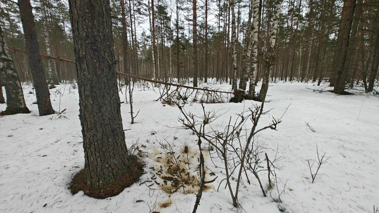 Сейчас глухарь питается в основном сосновой хвоей. Чтобы дерево не заняли другие самцы, он и кормится, и сидит на нем же. Бурые пятна на снегу — это как раз переваренная хвоя.