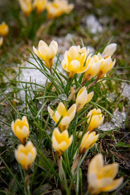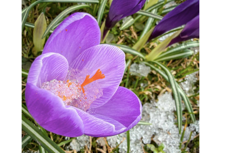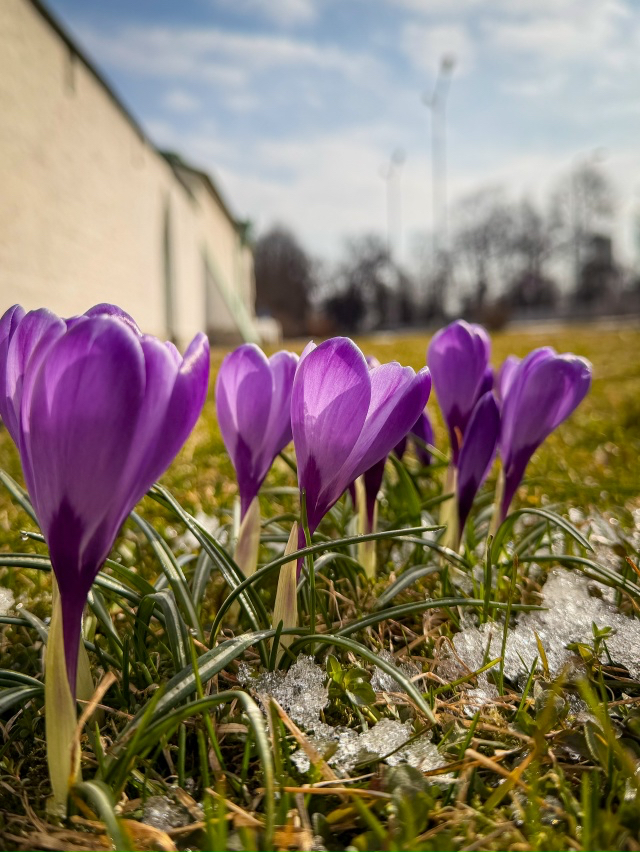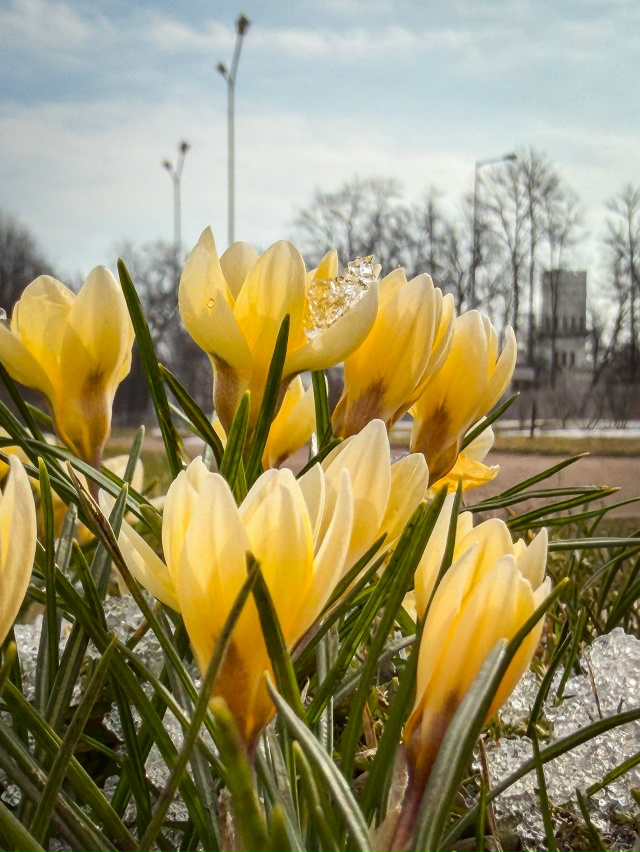 Вблизи Ратной палаты в Царском Селе распустились первые крокусы — миниатюрные и хрупкие цветы, которые пробиваются сквозь еще не растаявший снег.