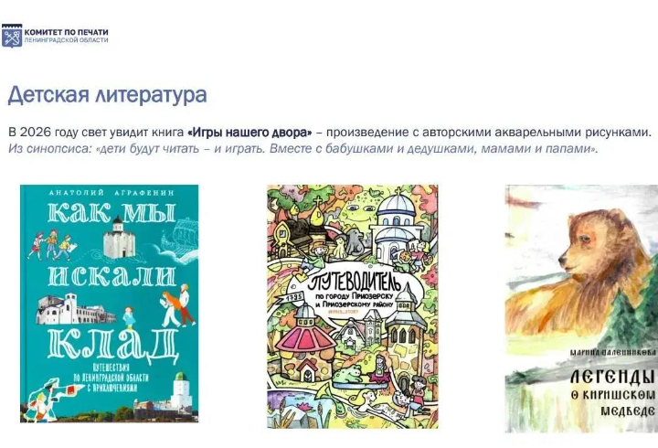 В 2026 году планируется выпуск ряда значимых изданий, включая книги к 85-летию Дороги жизни, материалы об участниках специальной военной операции и волонтерах, а также «Белую книгу» для слабовидящих детей, выполненную шрифтом Брайля.