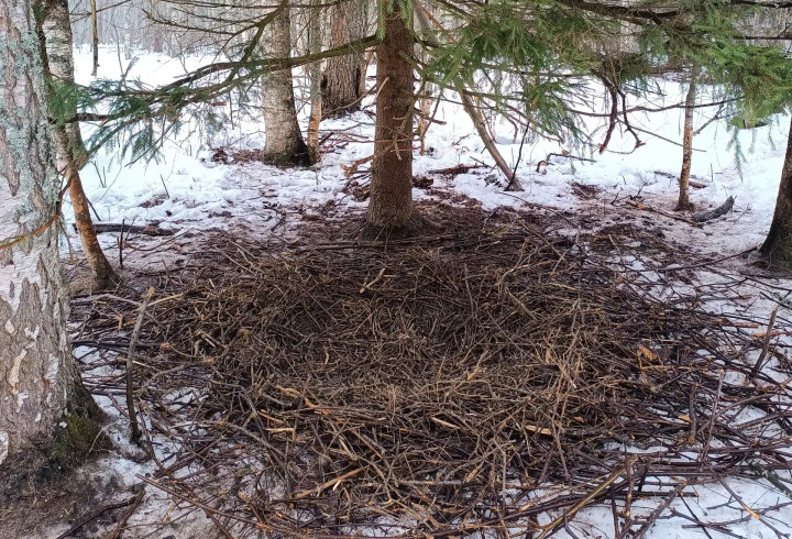 Как поясняют экологи, дикие свиньи сооружают подобные укрытия для отдыха в холодное время года и выведения потомства. Обычно такие гнезда располагаются под крупными елями - в местах с хорошим обзором и естественной защитой.