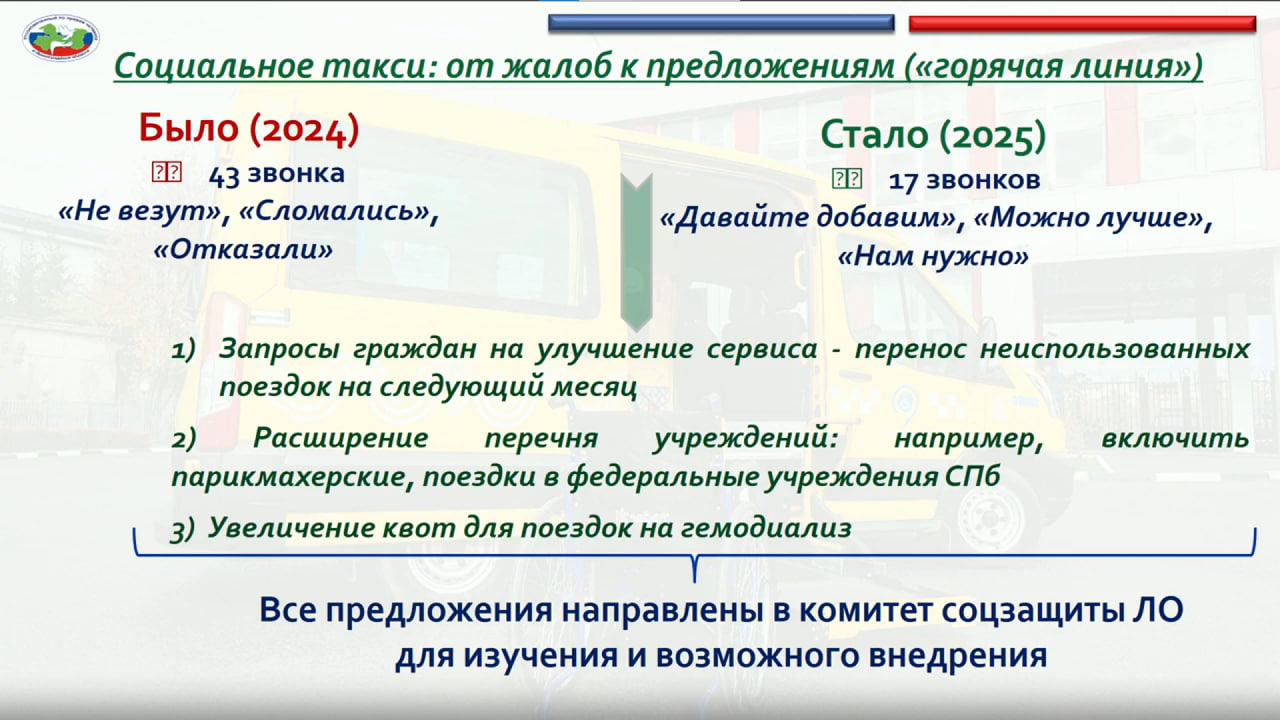 «Социальное такси это вообще отдельная история. Здесь мы видим не просто снижение цифр, а смену самого настроения. В 2024 году на горячую линию по соцтакси поступило 43 звонка. Только на горячую, не считая всех жалоб и обращений в течение года. И это были крики о помощи. Мы разбирались с перевозчиками. Теперь посмотрите на 2025 год — всего 17 звонков. Никто не кричит “спасите”, а вместо жалоб “спасибо всем”. Как не аплодировать такой работе социального блока».