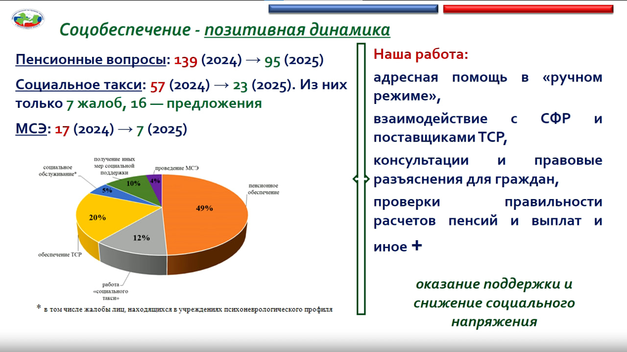 Подводя итоги года, Шабанов сообщил о позитивных изменениях в социальной сфере. Он подчеркнул, что количество обращений по пенсионным вопросам сократилось почти на треть, что, по его мнению, свидетельствует не об исчезновении трудностей у пенсионеров, а о более грамотном и оперативном решении вопросов непосредственно на местах. Кроме того, он привел данные по медико-социальной экспертизе, где число обращений снизилось с 17 в 2024 году до 7 в 2025-м.