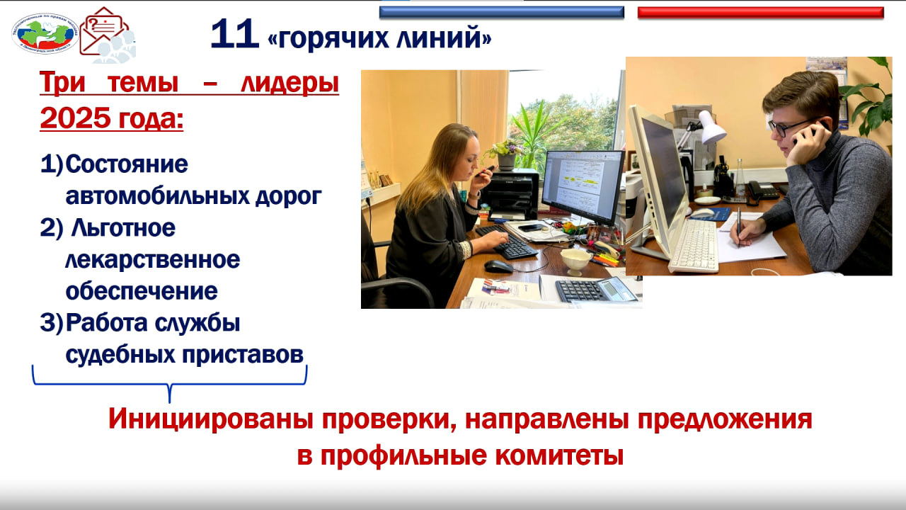 Кроме того, в докладе было отмечено, что граждан волновали вопросы наружного освещения, льготного лекарственного обеспечения — в частности, отсутствие жизненно важных препаратов и длительные задержки в выдаче решений об отказе в рецептах, — а также работа службы судебных приставов, неисполнение судебных решений и необоснованные списания средств. Шабанов подчеркнул, что аппарат фиксирует высокий запрос граждан на правовую определенность и реагирует на него.