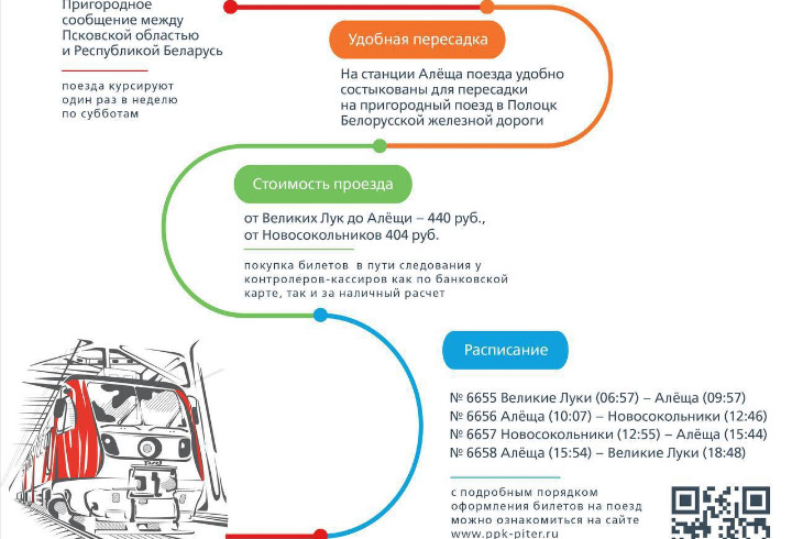 Поезда курсируют по субботам и уже стали удобным вариантом для коротких путешествий. Время в пути составляет около трех часов, а стоимость билета — от 404 рублей из Новосокольников и от 440 рублей из Великих Лук.