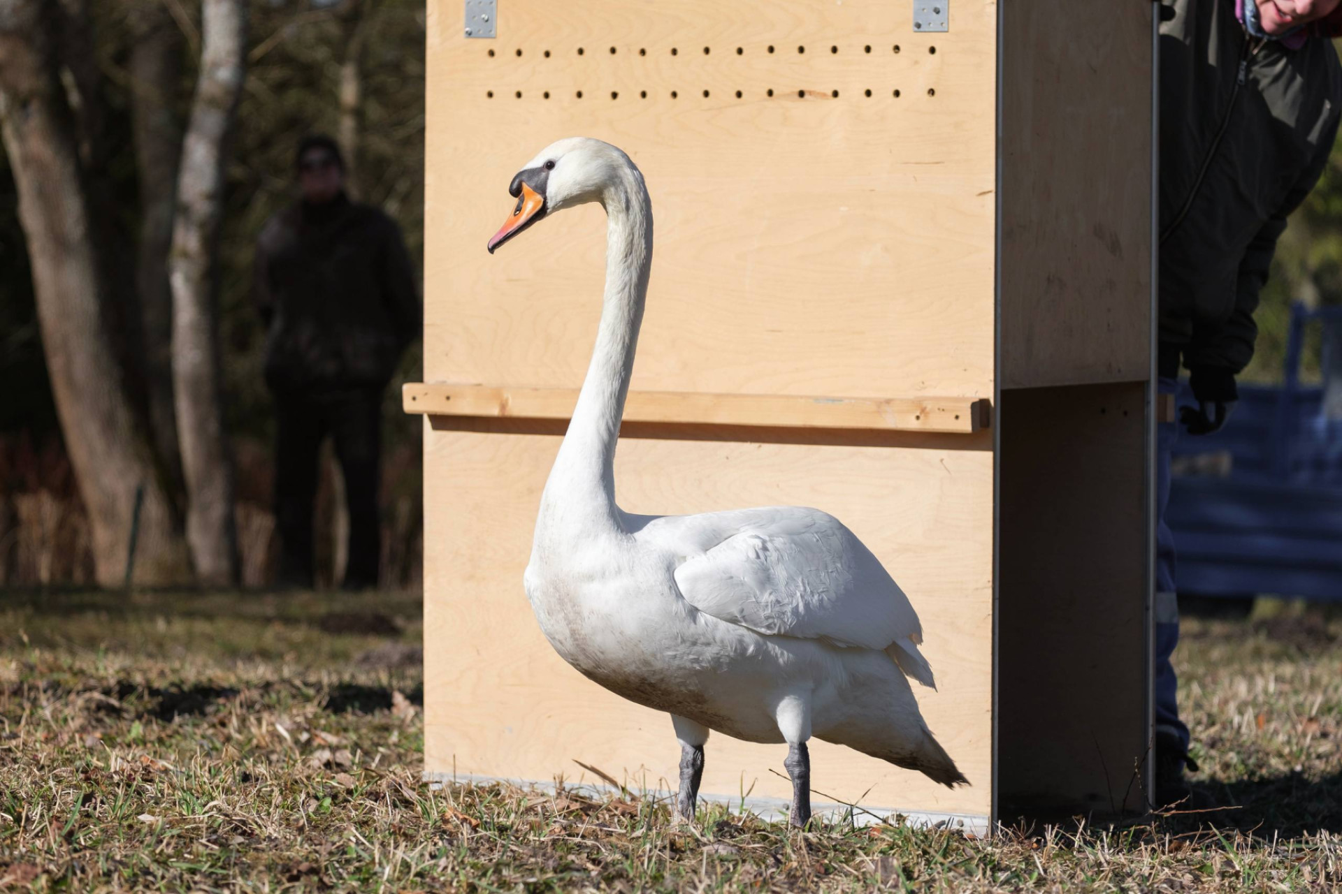Первая лебединая пара покинула зимние апартаменты на Дворцовой ферме, входящей в состав музея-заповедника «Гатчина». Пернатые ненадолго прогулялись по газону и затем спустились на воду Чесменской бухты.