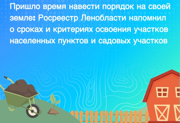 Росреестр по Ленинградской области напомнил собственникам о сроках и критериях освоения земельных участков в населённых пунктах, а также садовых и огородных территорий. Речь идёт о землях, где ранее были выявлены признаки неиспользования.