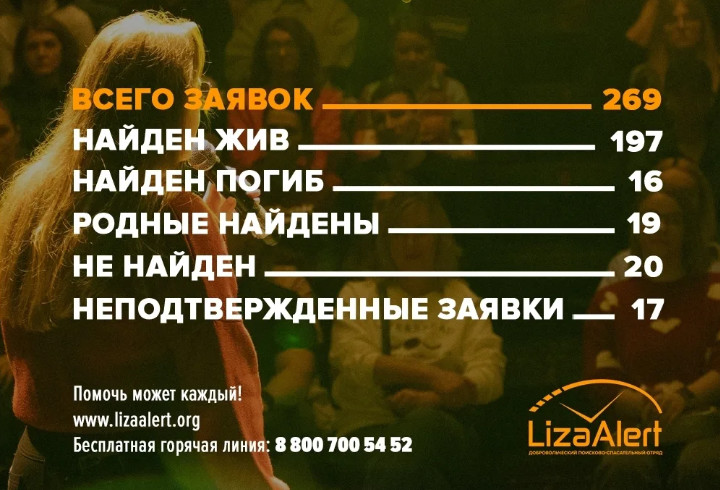 Поисково-спасательный отряд «ЛизаАлерт» подвел итоги работы в Санкт-Петербурге и Ленинградской области за март 2026 года. За месяц волонтеры получили 269 заявок о пропаже людей. В большинстве случаев поисковые операции завершились успешно - были найдены 197 человек.