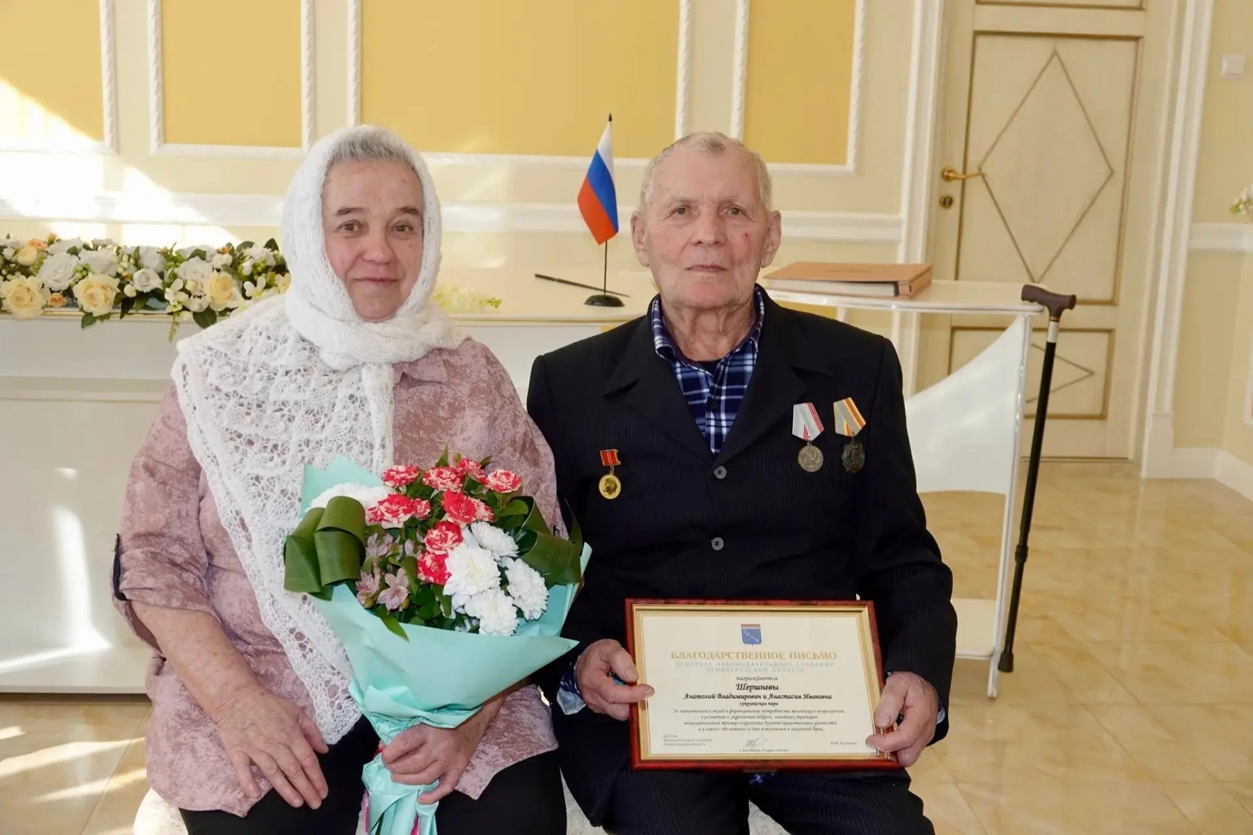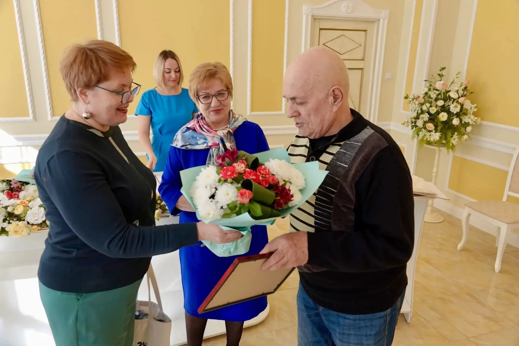 В четверг, 9 апреля, в Бокситогорском отделе ЗАГС прошло торжественное мероприятие в честь пар, проживших в браке 50 и 60 лет. «Золотых» и «бриллиантовых» юбиляров семейной жизни пришли поздравить глава Бокситогорского городского поселения Ирина Титова, а также Ольга Девяткина — помощник депутата Законодательного собрания Ленинградской области Николая Пустотина.