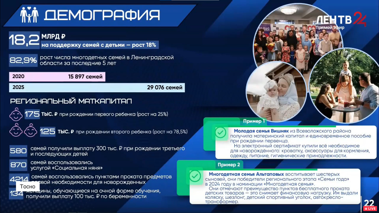Ленинградская область вошла в число регионов, получивших федеральное софинансирование. В регионе запустили сразу пять новых мер поддержки из федерального «демографического меню». Среди них — выплата 100 тысяч рублей для беременных студенток колледжей и вузов, компенсация аренды жилья молодым семьям, услуга «социальная няня», пункты проката детских товаров, а также 300 тысяч рублей при рождении третьего ребенка в молодой семье.