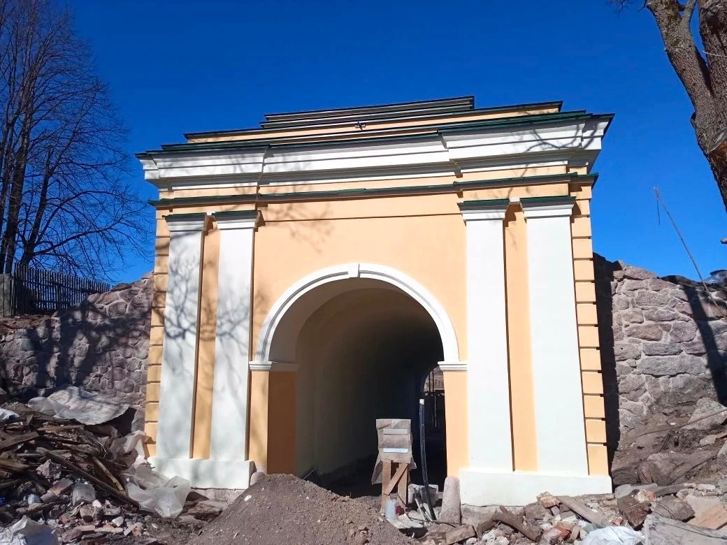 На стройплощадке заканчивают уборку после зимы и демонтируют леса. В здании Кордегардии уже стоят окна, внутри завершается отделка. Параллельно специалисты прокладывают наружные сети водоснабжения и канализации. А на Фридрихсгамских воротах приступили к восстановлению исторической брусчатки.