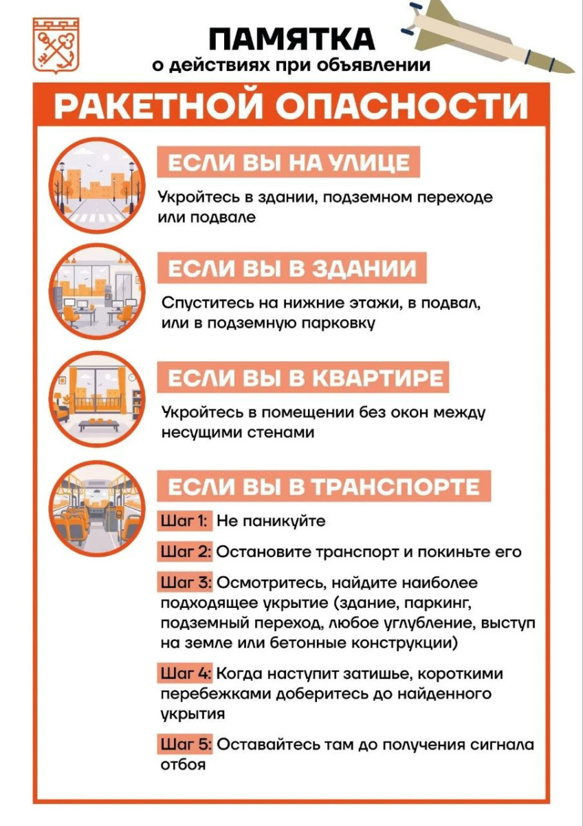 Власти призывают при получении сигнала незамедлительно покинуть открытые пространства и укрыться в капитальных зданиях, находясь внутри - держаться подальше от окон и находить укрытие у несущих стен. Особое внимание уделяется запрету на контакт с неизвестными предметами: их категорически нельзя поднимать или осматривать.