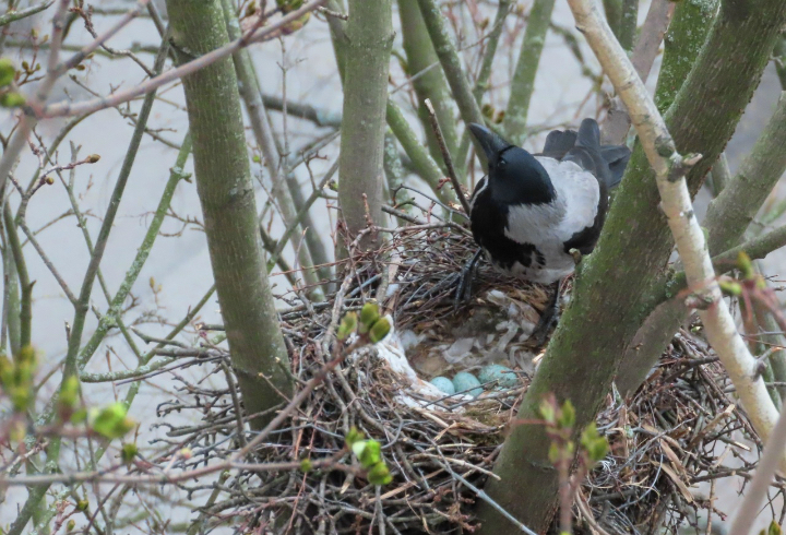 В Санкт-Петербурге, на Васильевском острове, запечатлели поведение семьи серой вороны в период гнездования. В гнезде находятся четыре яйца, и птицы активно защищают свою территорию от других пернатых соседей.