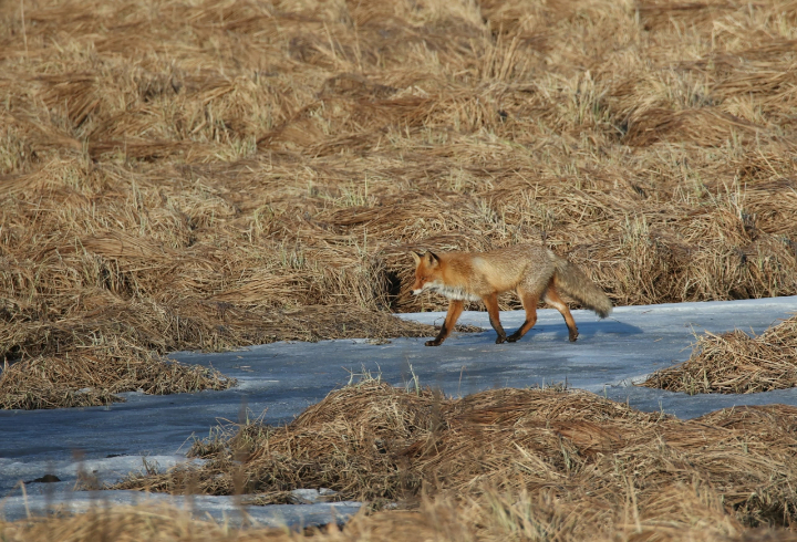 На кадре рыжая хищница шагала по льду, почти незаметная на фоне высохшей прошлогодней травы. Удалось снять зверя Анатолию Смирнову.