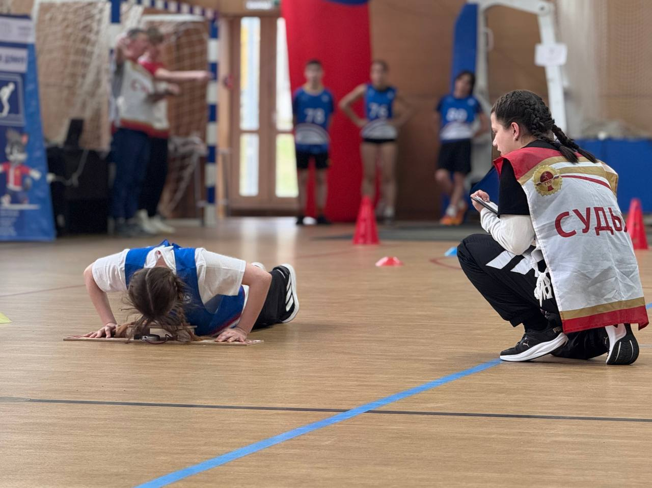 Программа мероприятия включала испытания на физическую подготовку - участники выполняли упражнения на пресс, отжимания, прыжки в длину и наклоны. Также прошла командная ГТО-эстафета, где школьники демонстрировали выносливость и слаженность действий.