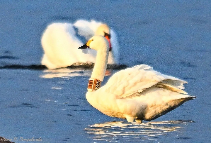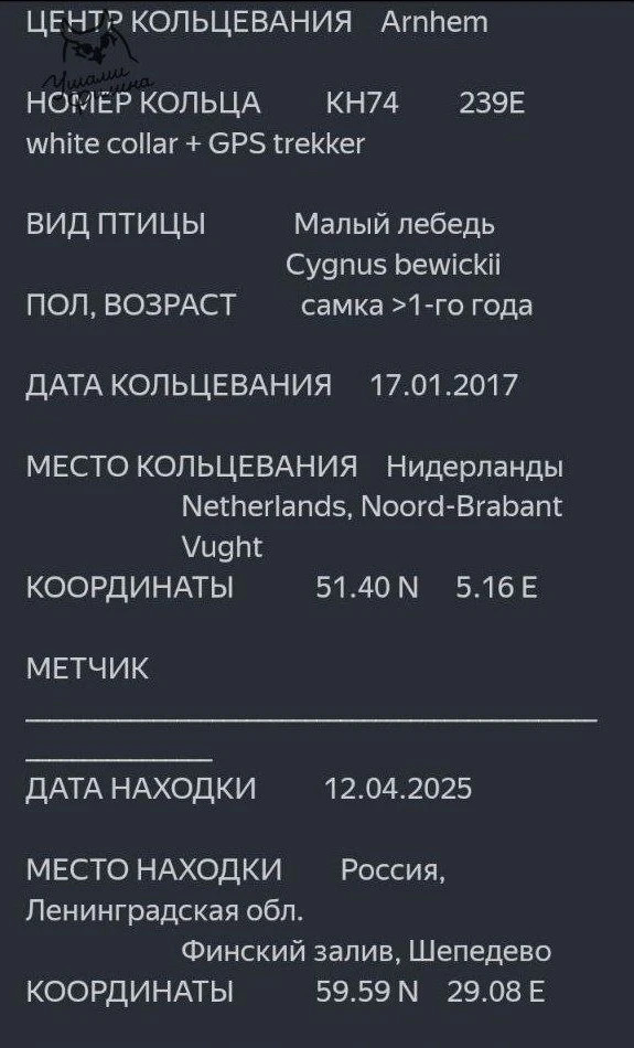 В Ломоносовском районе Ленинградской области зафиксирован редкий случай наблюдения малого лебедя с установленным ранее зарубежным трекинговым оборудованием. Птицу с крупным шейным чипом обнаружил и запечатлел фотограф Николай Петровичев в районе Шепелево.