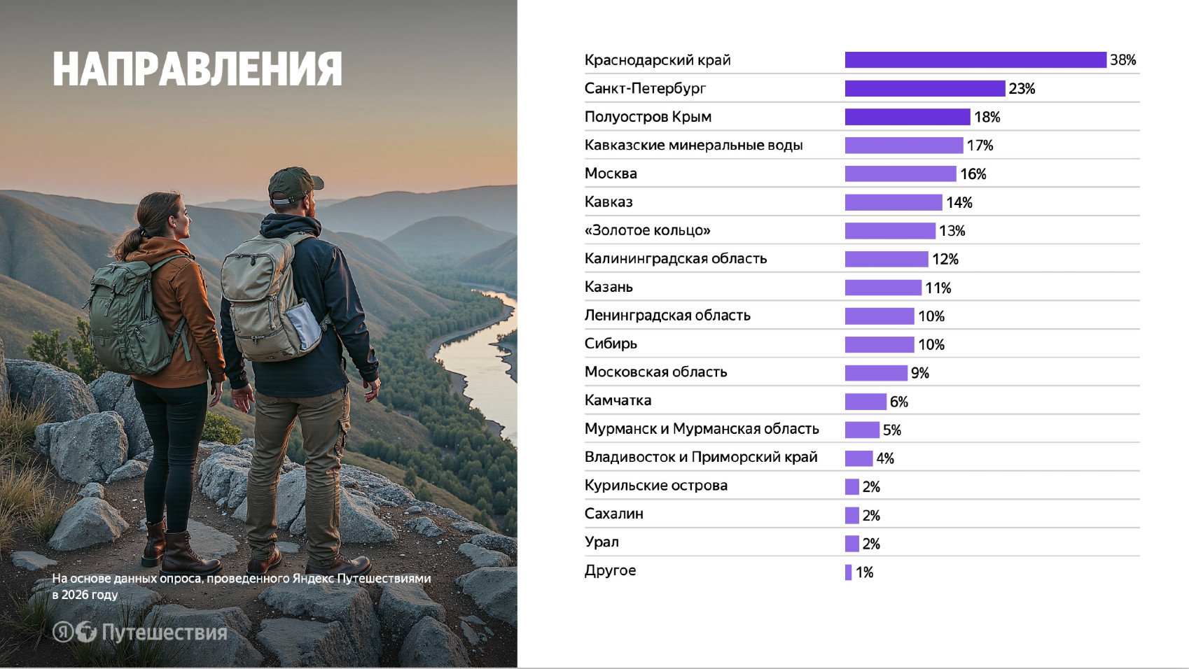 Подавляющее большинство россиян планируют поездки в 2026 году, при этом основной акцент смещается на внутренний туризм. Согласно исследованию сервиса «Яндекс Путешествия», 84% опрошенных намерены отправиться в поездки до конца года.