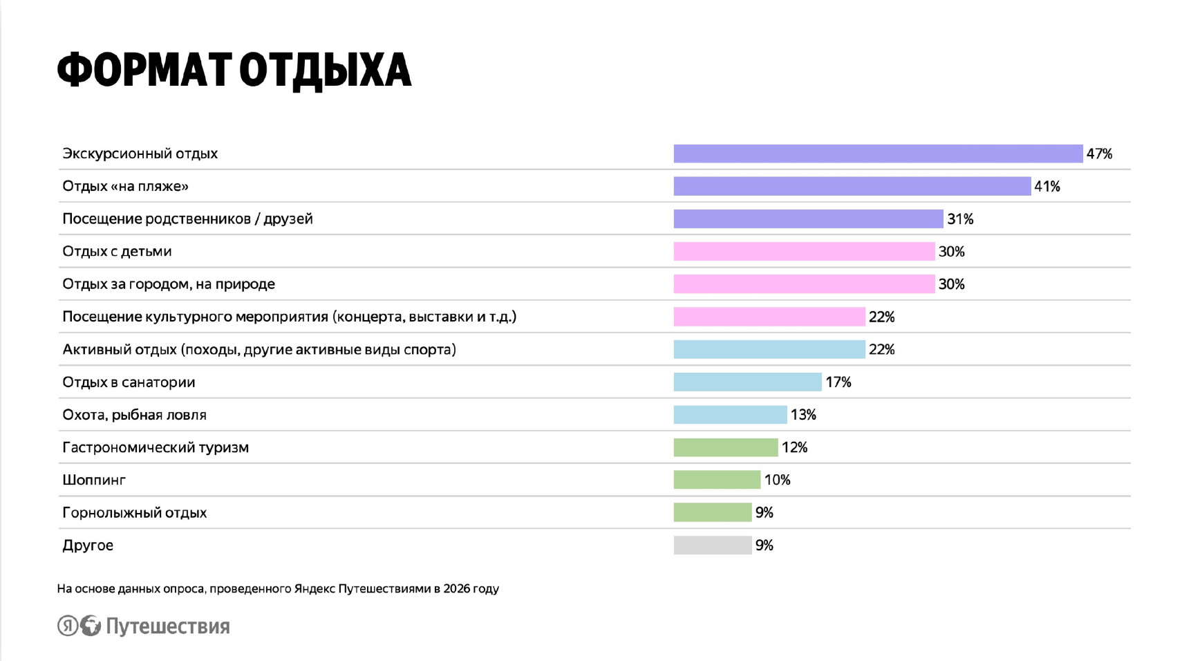 Эксперты отмечают, что туристическое поведение становится более гибким: россияне комбинируют различные форматы отдыха, включая пляжный, экскурсионный, гастрономический и событийный туризм.