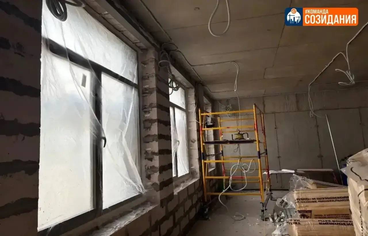 Внутри уже смонтированы внутренний парапет и выполнена стяжка пола. В настоящее время основные работы сосредоточены на фасаде: ведется подготовка вентилируемой системы, установка металлоконструкций и отделка внешнего парапета.